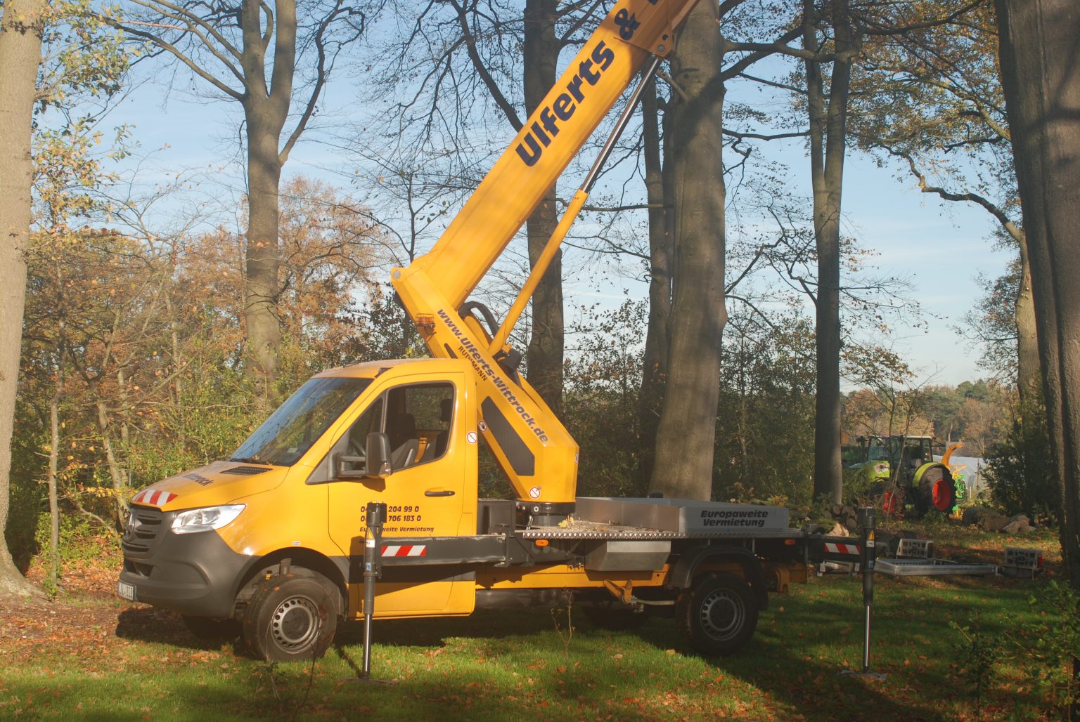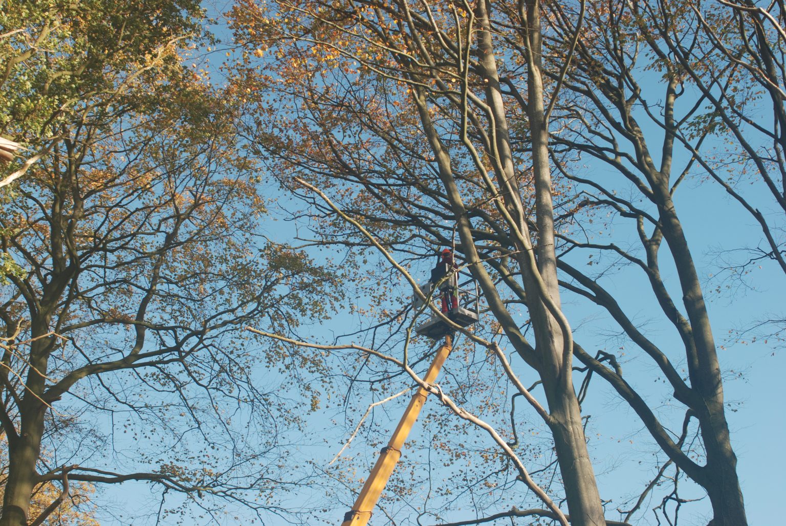 Für Arbeiten in großer Höhe nutzen wir eine Hubarbeitsbühne. Ist für schweres Gerät kein Platz oder der Untergrund nicht geeignet, klettern wir in den Baum.